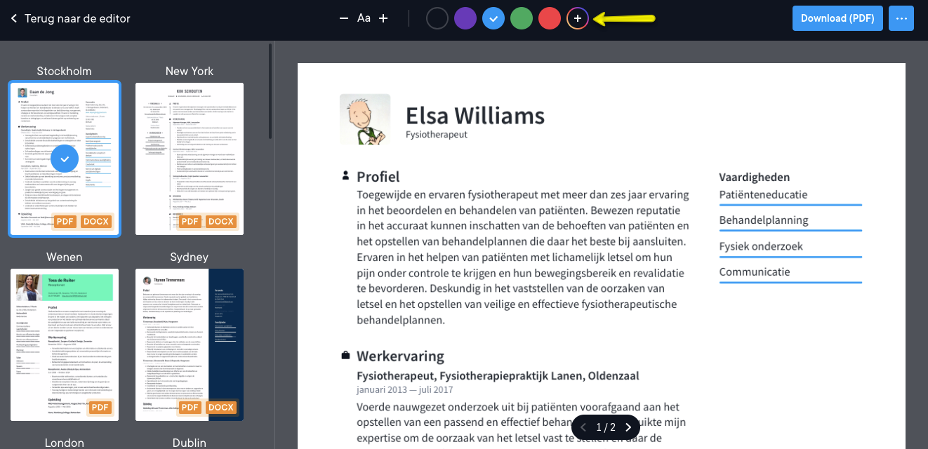 Wijzig het ontwerpthema / de ontwerpkleur – Lees hier meer over hoe je een template kan wijzigen en kleuren kan aanpassen. Gebruik onze makkelijke kleurentool om je cv nog meer te laten stralen.