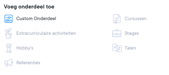 Een andere manier om jouw cv te personaliseren is door aangepaste onderdelen te gebruiken die je zelf inricht. De titel hiervoor kan je zelf kiezen. Scrol helemaal naar beneden op de cv-editor voor de verschillende opties voor het toevoegen van nieuwe onderdelen: