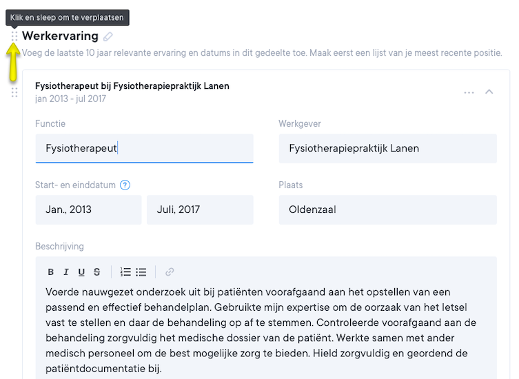 Ordenen van onderdelen - Voor onderdelen na Persoonlijk profiel in de hoofdkolom van het cv kan de volgorde worden aangepast. Om een onderdeel opnieuw te ordenen, klik je aan de linkerzijde op het grid-icoontje. Je kunt deze omhoog en omlaag slepen. Zie hieronder: