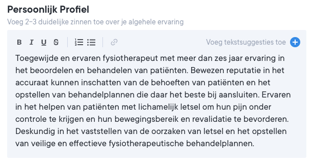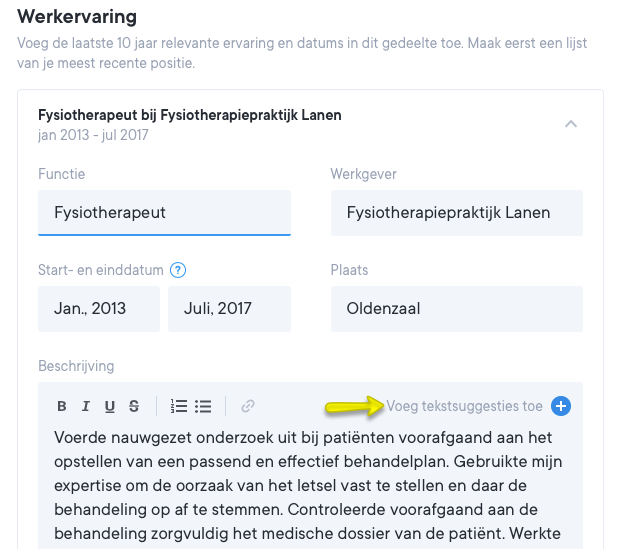 En vergeet niet! We bieden nu tekstsuggesties aan die je kunt gebruiken om jouw cv te maken. Hoe werkt het?