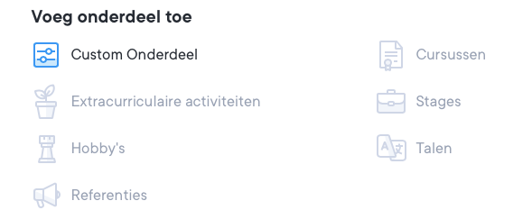 Je kunt zelfs een aangepast, persoonlijk onderdeel toevoegen en er om het even welke titel aan geven. Als je jouw onderdelen hebt toegevoegd, kan je ervoor kiezen om de onderdelen van je cv opnieuw te ordenen.