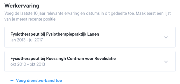 Dit is het belangrijkste deel van jouw cv. Vermeld alleen de relevante werkervaring van de afgelopen 10 jaar. Lees hier is een nuttig artikel over wanneer je alle banen die je in het verleden heb gehad in je cv moet (en juist niet moet) opnemen.