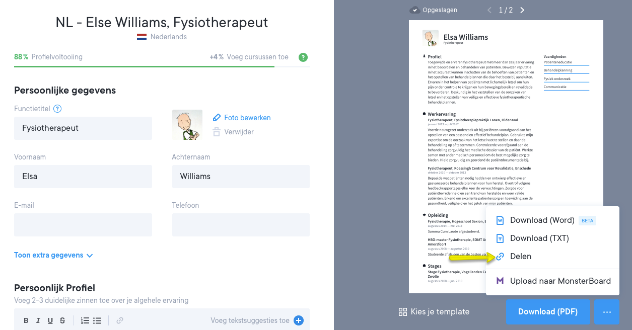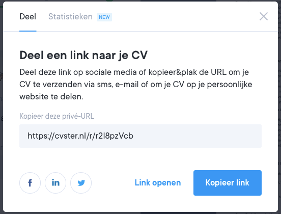 Elke versie van jouw cv heeft zijn eigen unieke URL die gedeeld kan worden. Als je meerdere versies van jouw cv hebt aangemaakt, heb je ook verschillende URL's die je kunt delen.