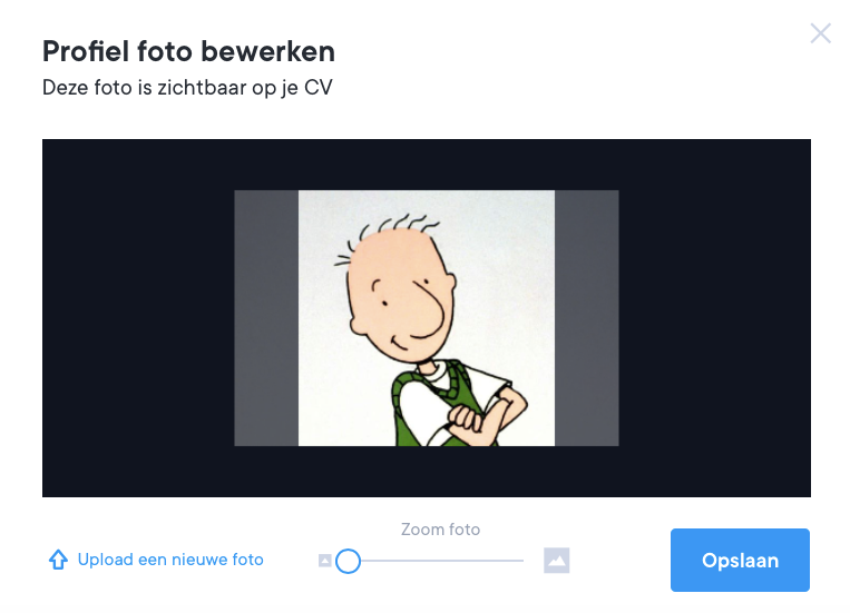 De foto voor jouw cv is idealiter vierkant, met een beeldratio van 1:1 en minstens 600 x 600 pixels. Er zijn ook een aantal opties beschikbaar om jouw foto aan te passen zodra deze is geüpload. Zie onderstaand screenshot.