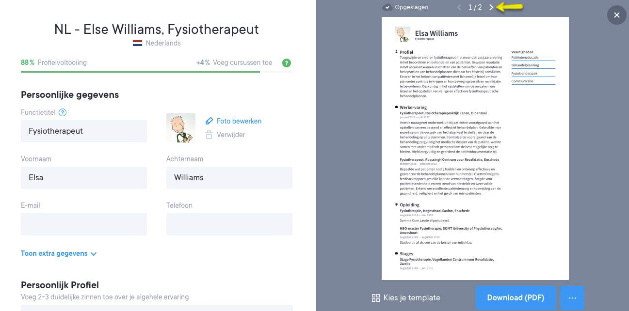 Wanneer je een voorbeeld van jouw cv of sollicitatiebrief bekijkt, zie je bovenaan het scherm pijlen staan waarmee je naar de volgende pagina kan gaan. Zie onderstaand screenshot.