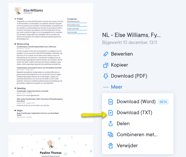 Om een tekstbestand van jouw cv of template te downloaden log je in op CVster.nl en navigeer je naar het dashboard. Klik op de link onder het hoofdmenu van je cv of sollicitatiebrief om het tekstbestand te downloaden. Zie onderstaand screenshot.
